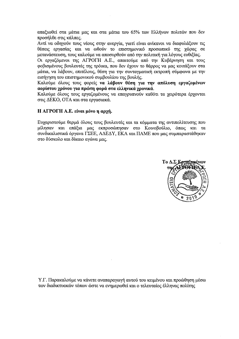 Ως προς την "Αγρογη", που αποτελει ιδιαζουσα περιπτωση, θυμιζω πως αμα τη αναληψει της θεσεως της υπουργου Αγροτικης Αναπτυξης, η Κατερινα Μπατζελη, πολυ ορθα, αφενος δηλωσε με ολους τους τονους πως οι προσληψεις στη συγκεκριμενη εταιρεια είναι παντελως και προκλητικα αδιαφανεις και ως εκ τουτου, οι συμβασεις ελεγχονται παρανομες και θεωρουνται ως μη γενομενες, και αφετερου ανακοινωσε την προθεση της κυβερνησης να προβει σε λυσεις των εν λογω συμβασεων εργασιας. Το σημαντικο του πραγματος είναι η χρονικη συγκυρια, δηλαδη, ολα αυτά σημειωθηκαν τον Οκτωβριο - Νοεμβριο του 2009,  εκτος πλαισιου κρισης και παρεπομενων δεινων. Το θεμα της Αγρογης επανηλθε στην επικαιροτητα με παρεμβαση του Παγκαλλιστου, ο οποιος, σε μια εξοχη επικοινωνιακα στρατηγικη κινηση, ανακινησε το θεμα, που στο μεταξυ ειχε αποτελματωθει λογω της ελληνικης γραφειοκρατιας αλλα και της πολιτικοοικονομικης ρευστοτητας της τοτε περιοδου, τον Ιουνιο του 2010, από την οθονη του φιλοκυβερνητικου Mega, προκειμενου να αποπροσανατολισει την κοινη γνωμη από το μειζον θεμα της καταβαραθρωσης των ασφαλιστικων δικαιωματων που δρομολογουσε το υπο ψηφιση, εκεινη τη βδομαδα, καταπτυστο ασφαλιστικο νομοσχεδιο Loveρδου.